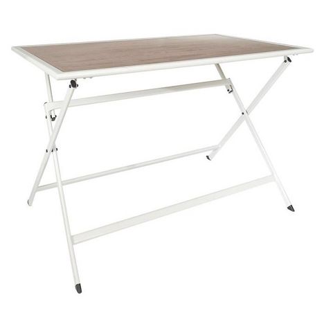 Informations Techniques : Dimensions : L. 110 x l. 70 x H. 71 cm Matières : Métal & Verre Trempé Spécificités : Pratique & Utile Table de jardin pliable Design effet bois Forme rectangulaire Poids : 14,4 kg Couleur : Blanc & Naturel