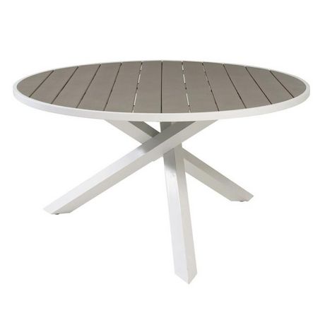 Informations Techniques : Dimensions : D. 140 x H. 73 cm Plateau : H. 3 cm Matières : Aluminium & Polystyrène Spécificités : Élégante & Pratique Table d'extérieur ronde Jusqu'à 6 convives Plateau aspect bois Revêtement enrobage Poids max supporté : 150 kg Poids : 25,5 kg Couleur : Gris & Blanc