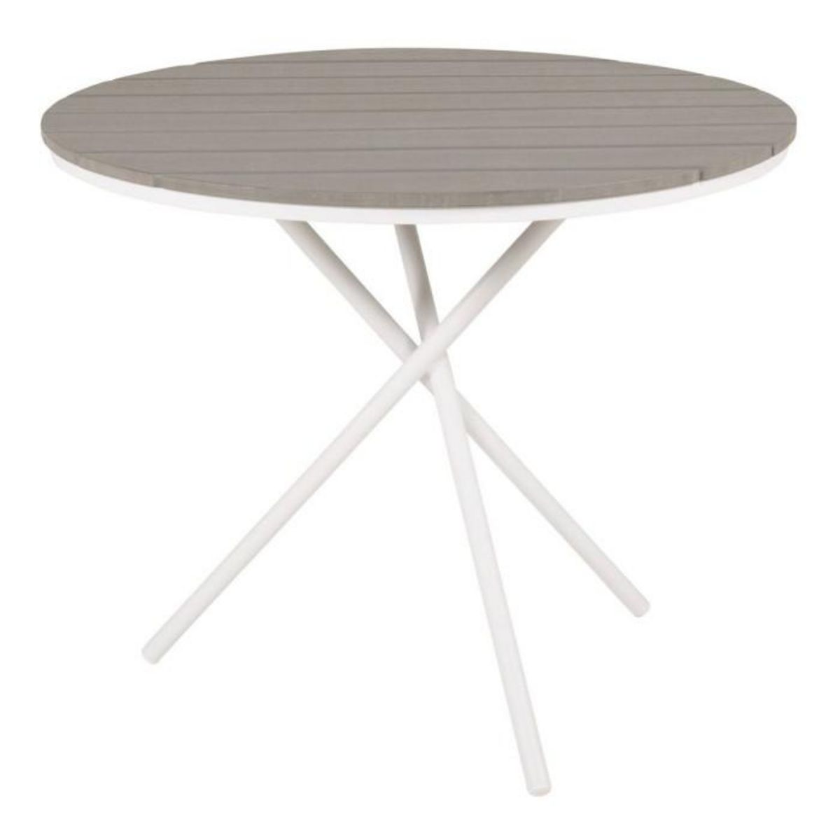 Informations Techniques : Dimensions : D. 90 x H. 74 cm Plateau : H. 3 cm Matières : Aluminium & Polystyrène Spécificités : Élégante & Pratique Table d'extérieur ronde Plateau aspect bois Revêtement en poudre Poids max supporté : 50 kg Poids : 7,96 kg Couleur : Gris & Blanc