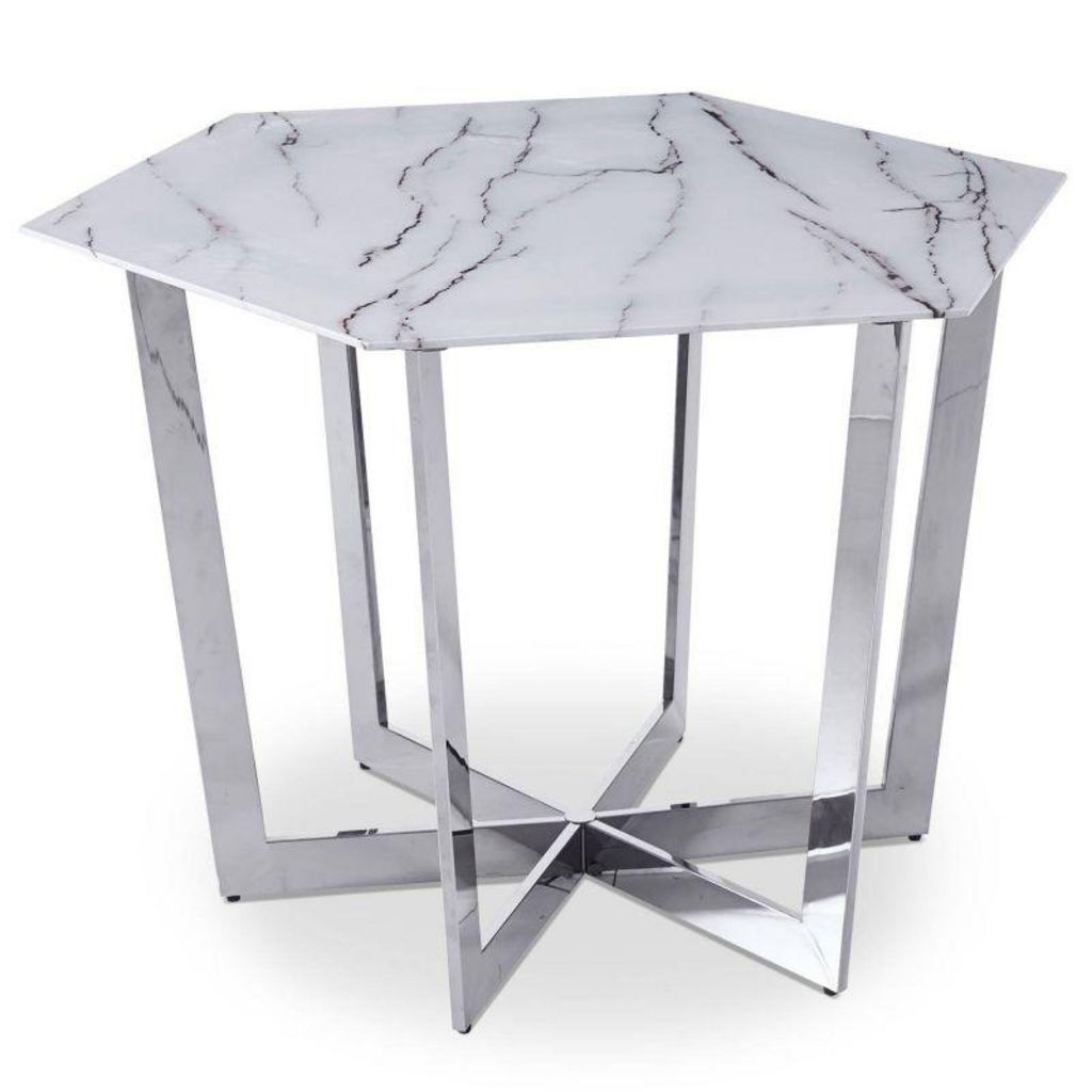 Informations Techniques : Dimensions : L. 120 x l. 120 x H. 75 cm Matières : Plateau : Verre Piètement : Métal Spécificités : Tendance & Moderne Table de Repas Forme Hexagonale Design effet Marbre Nombre de Couverts : 6 (maximum) Facile d'entretien (simple coup de chiffon humide) Montage facile No