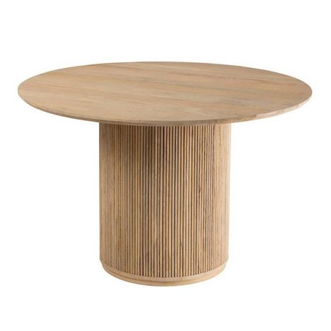Informations Techniques : Dimensions : Plateau : D. 120 x H. 3 cm Pied : D. 64 x H. 74 cm Matière : Bois de manguier Spécificités : Design & Pratique Table de repas Forme ronde A monter soi-même Poids : 47,5 kg Couleur : Naturel