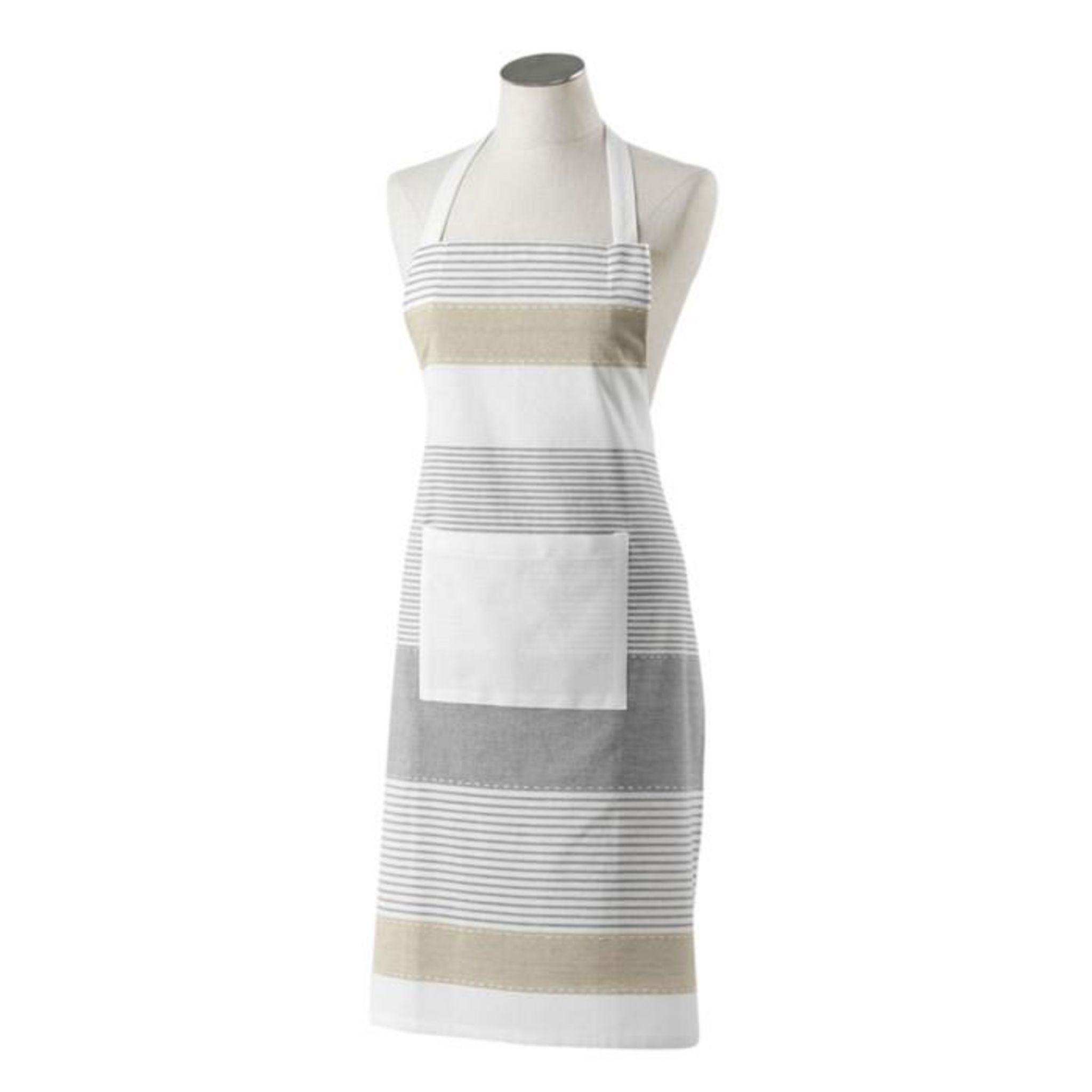 Informations Techniques : Dimensions : L. 60 x l. 84 cm Matières : 66% Coton & 34% Polyester Spécificités : Intemporel & Utile Tablier de cuisine Avec poche centrale Liens ajustables Imprimé à rayures Label Oeko-Tex Conseil d'entretien : Lavage à 40° Pas de séchage en machine Repassage à 150° Poids