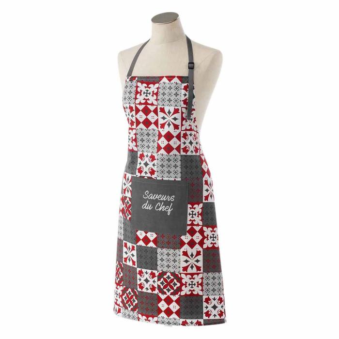Informations Techniques : Dimensions : L. 60 x l. 84 cm Matière : 100% Coton Spécificités : Doux & Agréable Tablier de Cuisine 1 Poche Effet Brodé Ajustable Motif Imprimé Poids : 0,135 kg Couleur : Gris & Rouge