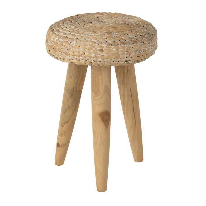 Informations Techniques : Dimensions : L. 30 x l. 30 x H. 40 cm Matières : 70% Bois (Teck) & 30% Jacinthe d'eau Spécificités : Pratique & Tendance Tabouret design 3 pieds Forme ronde Poids supporté : 80 kg Poids : 3 kg Couleur : Blanc