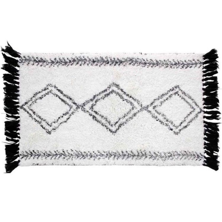 Informations Techniques : Dimensions : L. 80 x l. 50 cm Matière : 100% Coton Spécificités : Tendance & Pratique Tapis de Bain Forme Rectangulaire A Franges & A Motifs Poids : 0,56 kg Couleur : Blanc