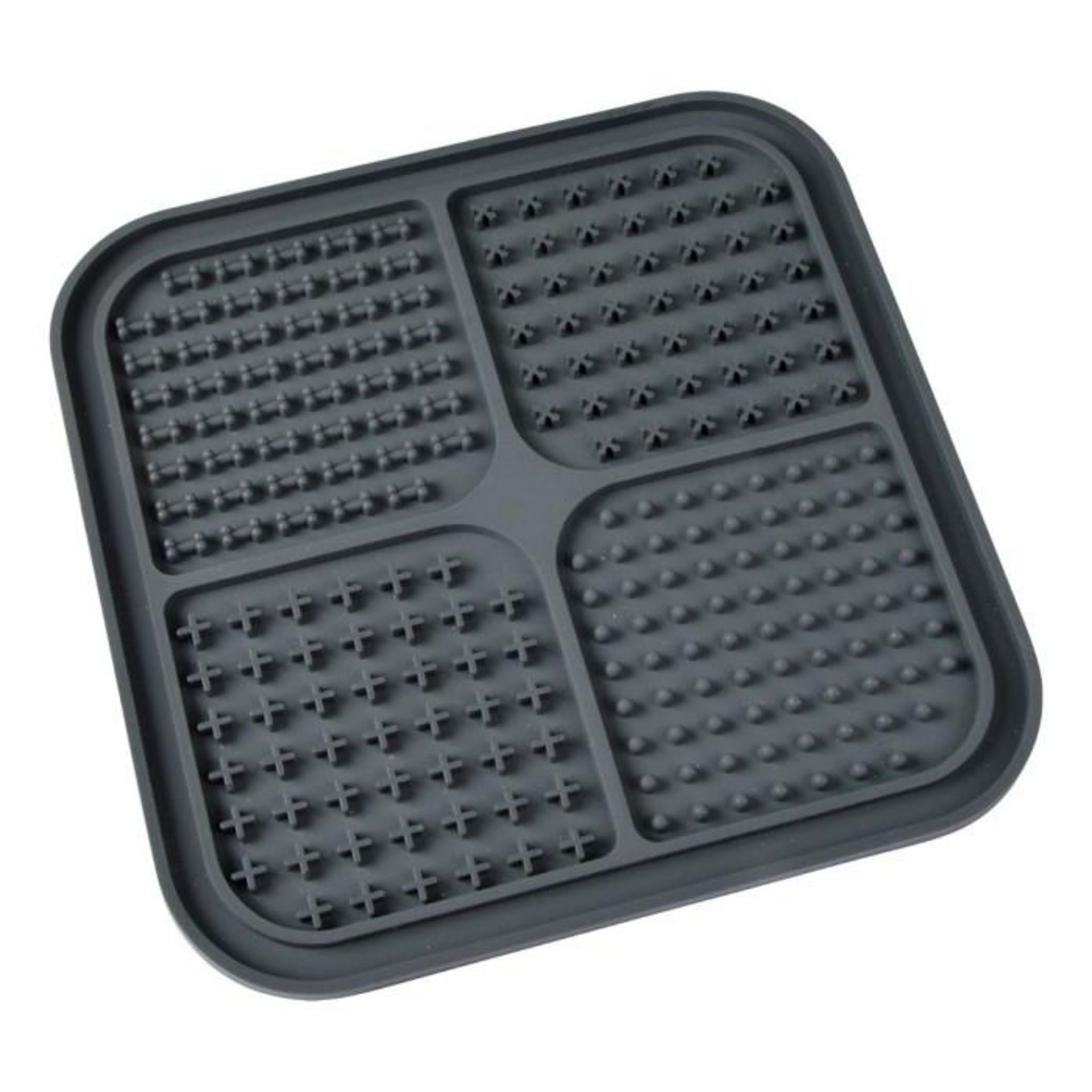 Informations Techniques : Dimensions : L. 20 x l. 20 x H. 1 cm Matière : Silicone Spécificités : Pratique & Stimule Tapis de léchage antidérapant 4 texture différentes Avec ventouses au dos Hygiène bucco-dentaire Passage au lave-vaisselle Poids : 0,12 kg Couleur : Anthracite