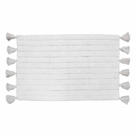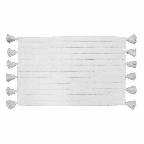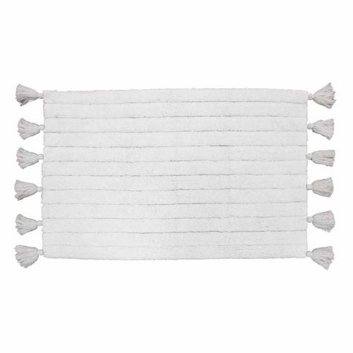 Informations Techniques : Dimensions : L. 50 x l. 80 cm Matière : Coton Spécificités : Design & Fonctionnel Tapis de Salle de Bain Forme Rectangulaire Avec Pompons Motif Jacquard Couleur : Blanc