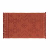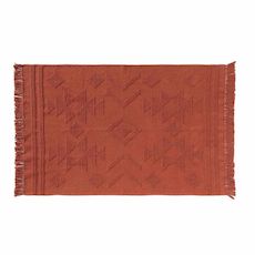 Informations Techniques : Dimensions : L. 120 x l. 170 cm Matière : 100% Coton Spécificités : Pratique & Utile Tapis Déco à Franges Forme Rectangulaire Motif Jacquard Couleur : Terracotta
