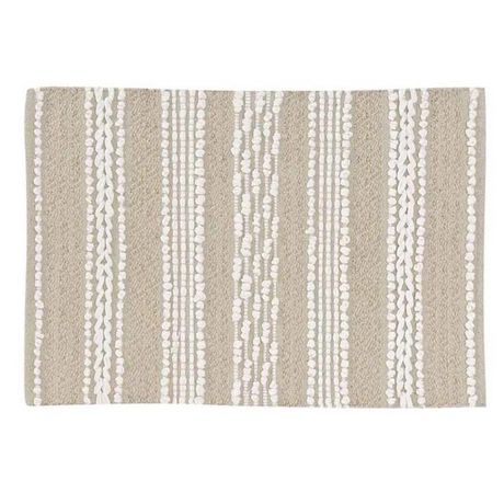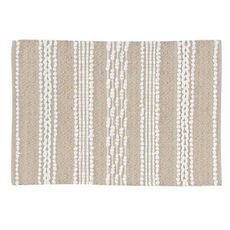 Informations Techniques : Dimensions : L. 90 x l. 60 cm Produit Packagé : L. 31 x l. 2 x H. 63 cm Matières : 48% Coton, 40% Polyester & 12% Fibres Spécificités : Pratique & Tendance Tapis Déco Forme Rectangulaire Fils Métallisés Poids : 0,81 kg Couleur : Naturel & Blanc