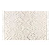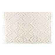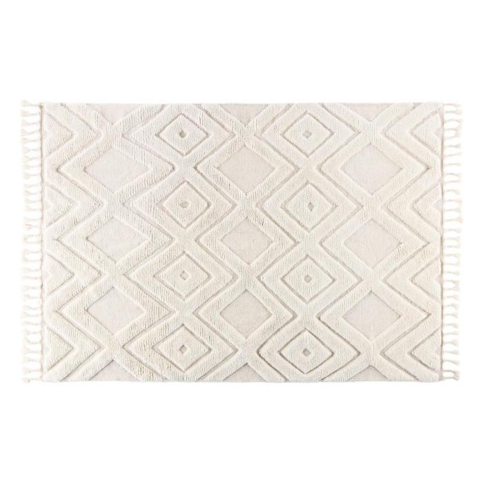 Informations Techniques : Dimensions : L. 230 x l. 160 x H. 1,7 cm Matière : Laine Spécificités : Déco & Cosy Tapis rectangulaire Poils courts denses Motifs en relief Franges tressées Poids : 7,6 kg Couleur : Blanc