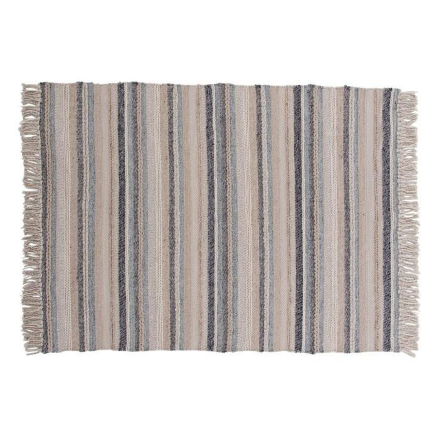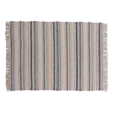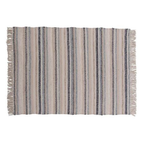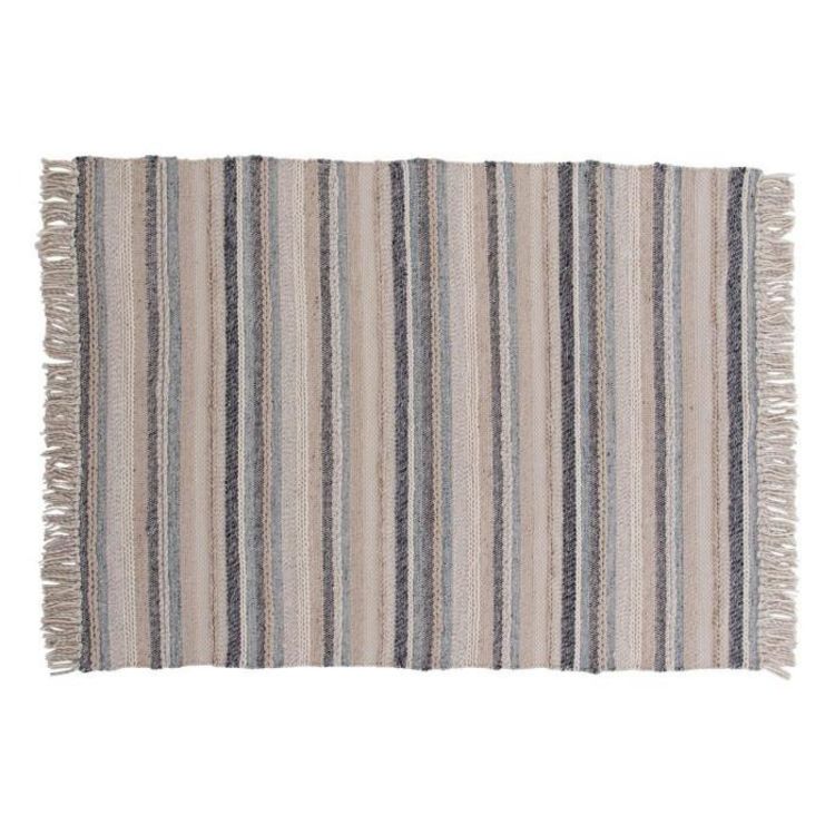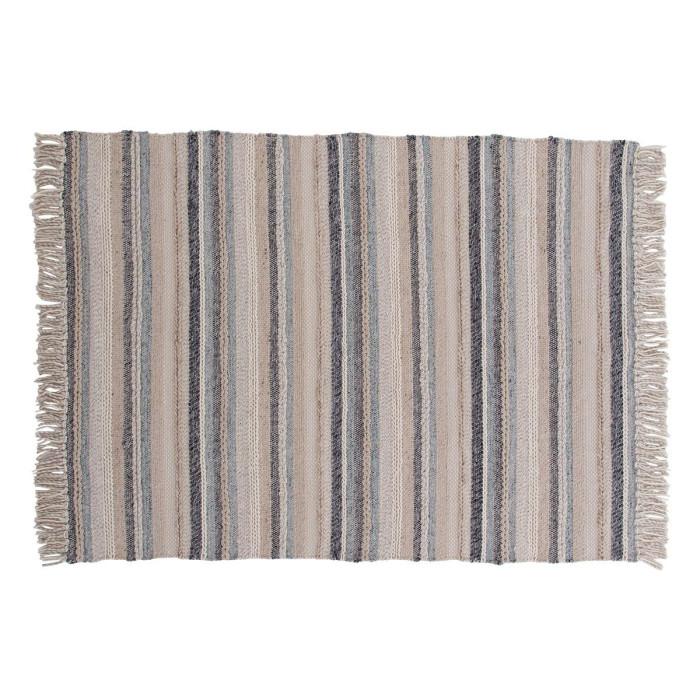 Informations Techniques : Dimensions : L. 240 x l. 170 x H. 1 cm Matière : Laine Spécificités : Déco & Moderne Tapis tissé plat Avec franges Détails décoratifs Forme rectangulaire Poids : 8,5 kg Couleur : Beige & Bleu