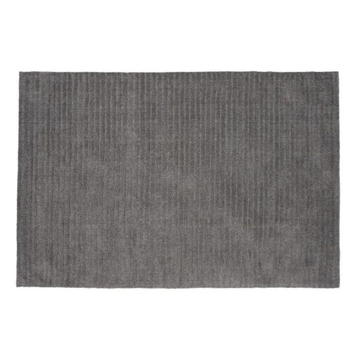 Informations Techniques : Dimensions : L. 300 x l. 202 x H. 1,5 cm Matières : 60% Laine & 40% Coton Spécificités : Moderne & Déco Tapis rectangulaire Motif nervuré Franges denses et courtes Poids : 20 kg Couleur : Gris Foncé