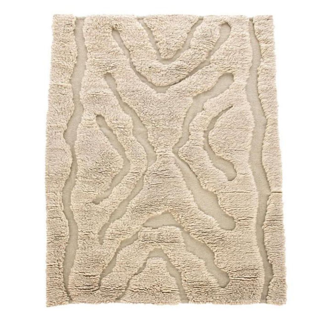 Informations Techniques : Dimensions : L. 240 x l. 172 x H. 3,8 cm Matières : 93% Laine & 7% Coton Spécificités : Cosy & Tendance Tapis tissé à la main Motif touffeté Forme rectangulaire Poids : 10,2 kg Couleur : Beige