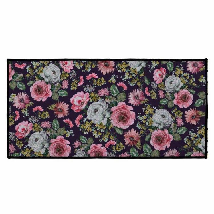 Informations Techniques : Dimensions : L. 115 x l. 57 cm Matières : Dessus : Nylon Dessous : Latex Spécificités : Chic & Design Tapis Déco Imprimé Forme rectangulaire Imprimé fleurs Couleur : Prune & Rose