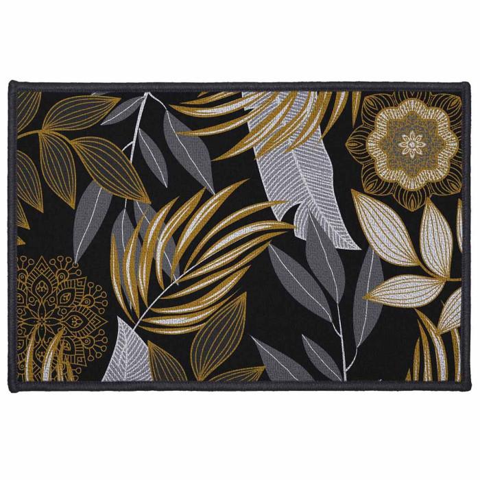 Informations Techniques : Dimensions : L. 60 x l. 40 cm Matières : Dessus : Polyamide Dessous : Latex Spécificités : Chic & Design Tapis Déco Imprimé Forme rectangulaire Imprimé feuilles Couleur : Noir & Or