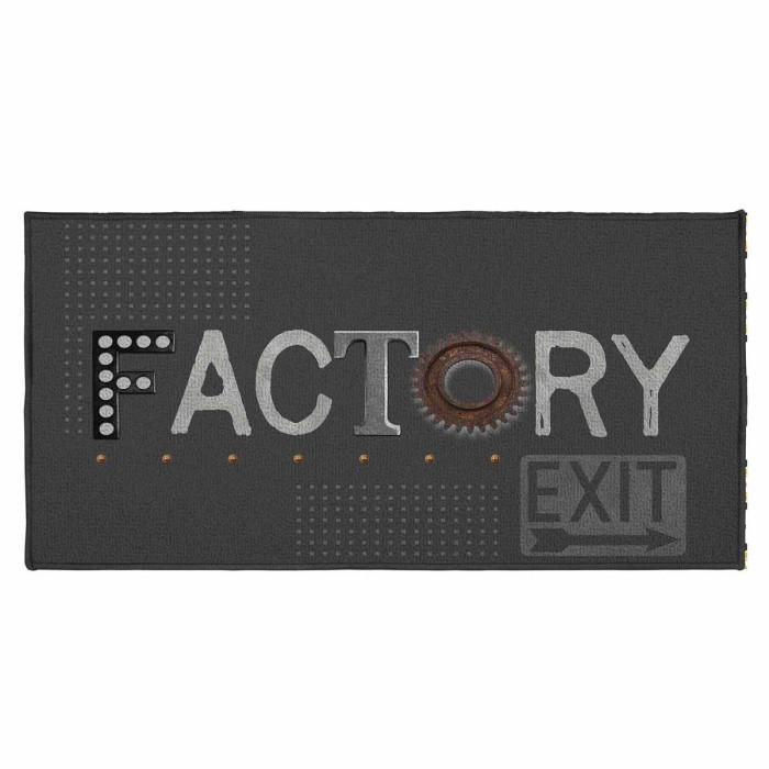 Informations Techniques : Dimensions : L. 115 x l. 57 cm Matières : Dessus : Polyamide Dessous : Latex Spécificités : Tapis Déco Imprimé Forme rectangulaire Imprimé : Factory Couleur : Gris