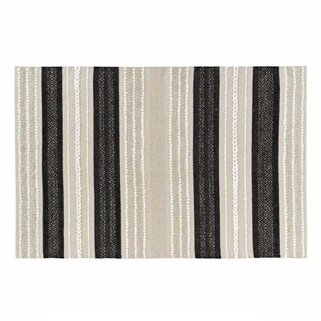 Informations Techniques : Dimensions : L. 170 x l. 120 cm Produit Packagé : L. 32 x l. 8 x H. 44 cm Matières : 48% Coton, 40% Polyester & 12% Fibres Spécificités : Pratique & Tendance Tapis Déco Forme Rectangulaire Fils Métallisés Poids : 2,67 kg Couleur : Naturel & Noir