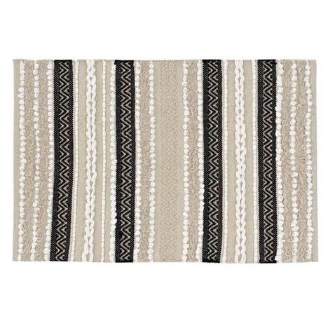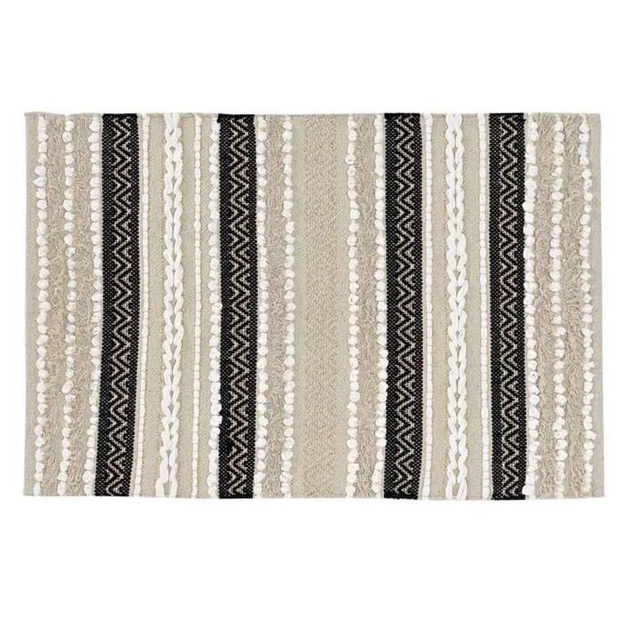 Informations Techniques : Dimensions : L. 90 x l. 60 cm Produit Packagé : L. 31 x l. 2 x H. 63 cm Matières : 48% Coton, 40% Polyester & 12% Fibres Spécificités : Pratique & Tendance Tapis Déco Forme Rectangulaire Fils Métallisés Poids : 0,81 kg Couleur : Naturel & Noir