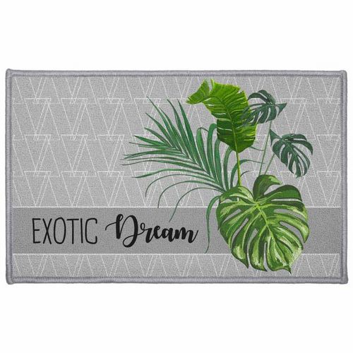 Informations Techniques : Dimensions : L. 80 x l. 50 cm Matières : Polyamide & Latex Spécificités : Antidérapant Pratique & Déco Imprimé : Feuilles de Palmier Texte : Exotic Dream Couleur : Gris