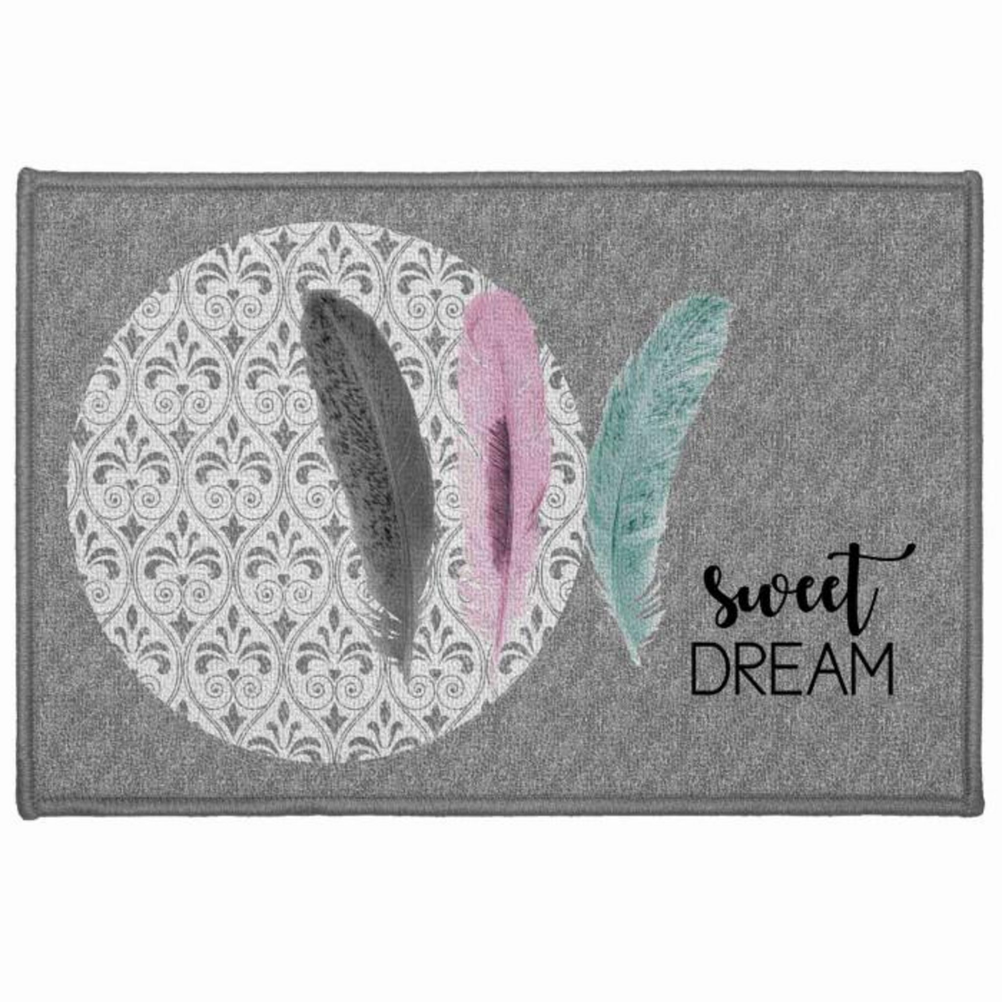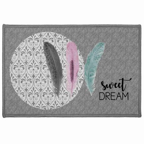 Informations Techniques : Dimensions : L. 60 x l. 40 cm Matières : Polyamide & Latex Spécificités : Antidérapant Pratique & Déco Imprimé : Plume Texte : Sweet Dream Couleur : Gris