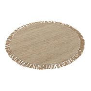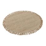 Informations Techniques : Dimensions : D. 150 x H. 2 cm Matières : 80% Laine & 20% Coton Spécificités : Pratique & Tendance Tapis déco Avec franges Tissage semi uni Forme ronde Poids : 6 kg Couleur : Beige