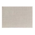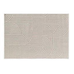 Informations Techniques : Dimensions : L. 170 x l. 120 cm Matière : 100% Polypropylène Spécificités : Pratique & Tendance Tapis déco Tissé à plat Motif en relief Design courbes Style Art Déco Forme rectangulaire Poids : 2,05 kg Couleur : Naturel