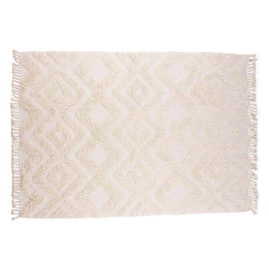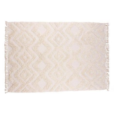 Informations Techniques : Dimensions : L. 350 x l. 250 x H. 1,5 cm Matière : Coton Spécificités : Tendance & Déco Tapis rectangulaire Tissé à la main Avec franges Motifs tuftés Poids : 8,75 kg Couleur : Blanc