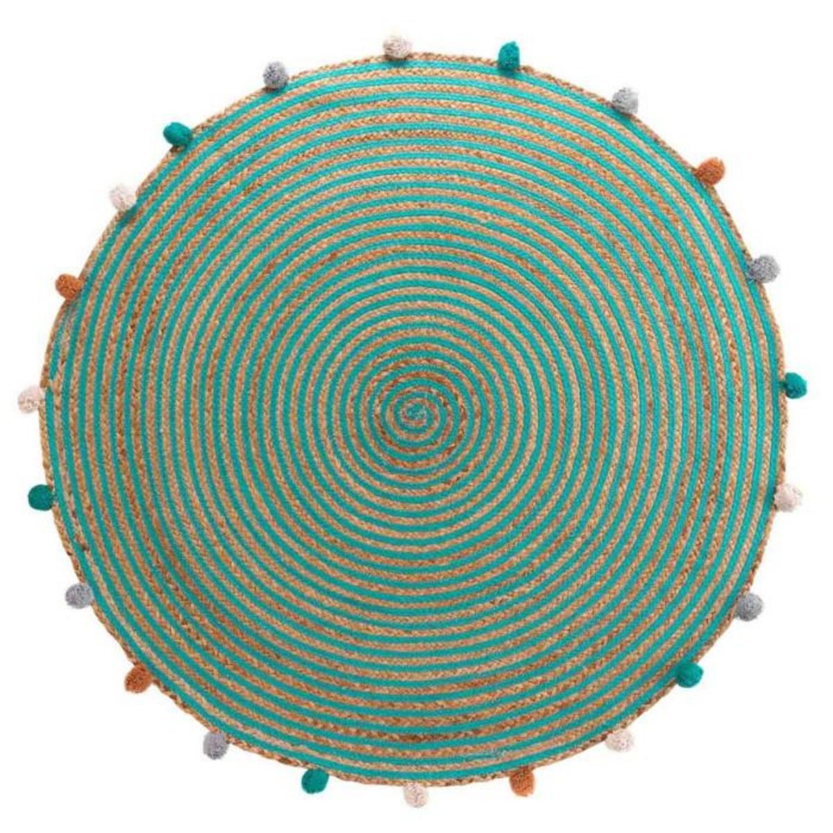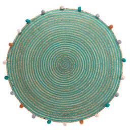 Informations Techniques : Dimensions : D. 90 cm Produit Packagé : L. 8 x l. 8 x H. 90 cm Matières : 62% Jute, 17% Coton, 9% Polyester & 7% Acrylique Spécificités : Pratique & Déco Tapis Enfant Forme Ronde Avec Pompons Design Uni Poids : 1,35 kg Couleur : Vert
