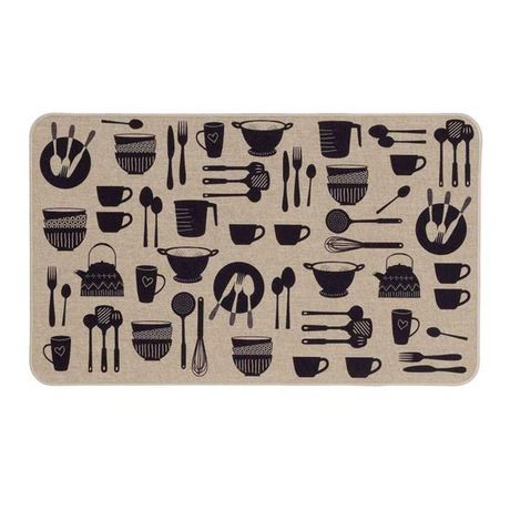 Informations Techniques : Dimensions : L. 75 x l. 45 cm Matières : Dessus : 100% Polyester Dessous : 100% Caoutchouc Spécificités : Utile & Déco Tapis multi-usage tissé Imprimé ustensiles de cuisine Antidérapant et anti-traces Semelle en caoutchouc Nettoyage facile Forme rectangulaire Entretien : La