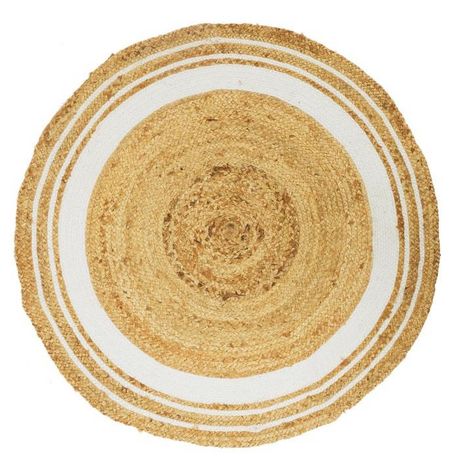 Informations Techniques : Dimensions : D. 90 x H. 1 cm Matières : Jute & Coton Spécificités : Pratique & Utile Tapis Déco Forme Ronde Poids : 3,15 kg Couleur : Blanc & Naturel