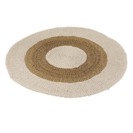 Informations Techniques : Dimensions : L. 150 x l. 150 x H. 1,5 cm Matière : 100% Herbe Marine Spécificités : Tendance & Moderne Tapis Déco Forme Ronde Style Bohème Poids : 2,7 kg Couleur : Blanc & Naturel
