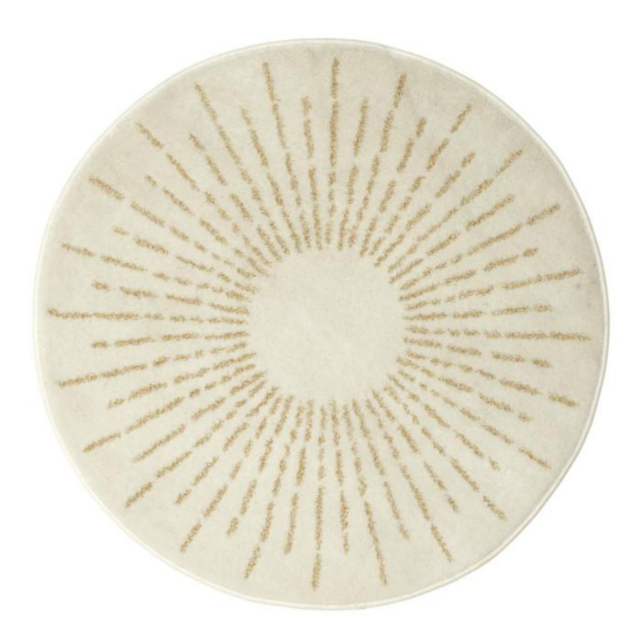 Informations Techniques : Dimensions : D. 80 x H. 2 cm Matières : Polypropylène & Polyester Spécificités : Pratique & Utile Tapis Déco Forme Ronde Design Soleil Fil Métallisé Poids : 1 kg Couleur : Beige