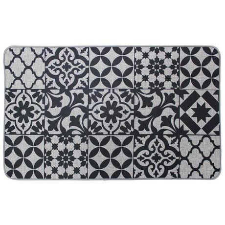 Informations Techniques : Dimensions : L. 75 x l. 45 cm Produit Packagé : L. 45 x l. 0,5 x H. 80 cm Matières : Dessus : 100% Polyester Dessous : 100% Caoutchouc Spécificités : Pratique & Utile Tapis Tissé Forme Rectangulaire A Motifs Finition Surjet Poids : 0,53 kg Couleur : Gris