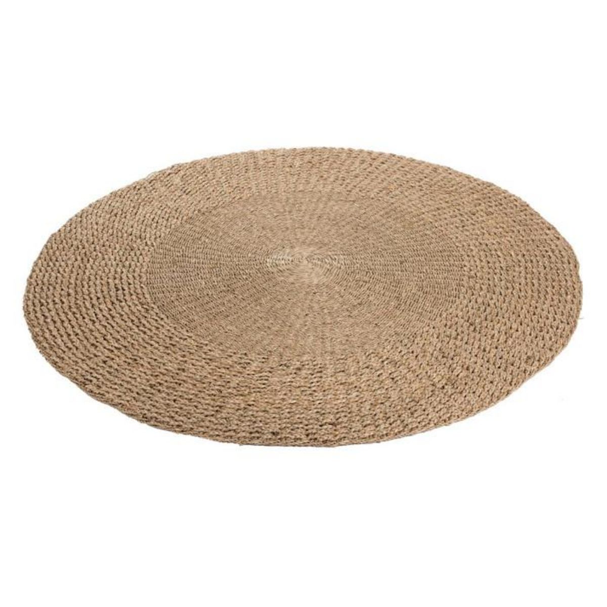 Informations Techniques : Dimensions : L. 120 x l. 120 x H. 1 cm Matière : 100% Herbe Marine Spécificités : Moderne & Tendance Tapis Déco Forme Ronde Effet Tressé Poids : 2,72 kg Couleur : Naturel