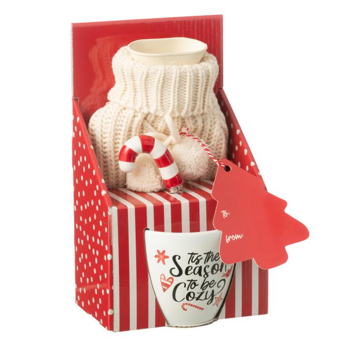 Informations Techniques : Dimensions : Tasse : L. 10,3 x l. 6,5 x H. 9 cm Bouillotte : L. 14 x l. 21,5 x H. 6,5 cm Matières : Céramique, Polyester, Acier & Papier Spécificités : Utile & Festif Ensemble tasse, cuillère et bouillotte Tasse avec inscription Cuillère en forme de sucre d'orge Bouillotte