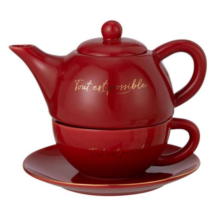 Informations Techniques : Dimensions : L. 19,2 x l. 12 x H. 15,5 cm Matière : 100% Porcelaine Spécificités : Utile & Élégante Théière 1 tasse Avec 1 sous-tasse Inscription tout est possible Poids : 1,22 kg Couleur : Rouge & Or
