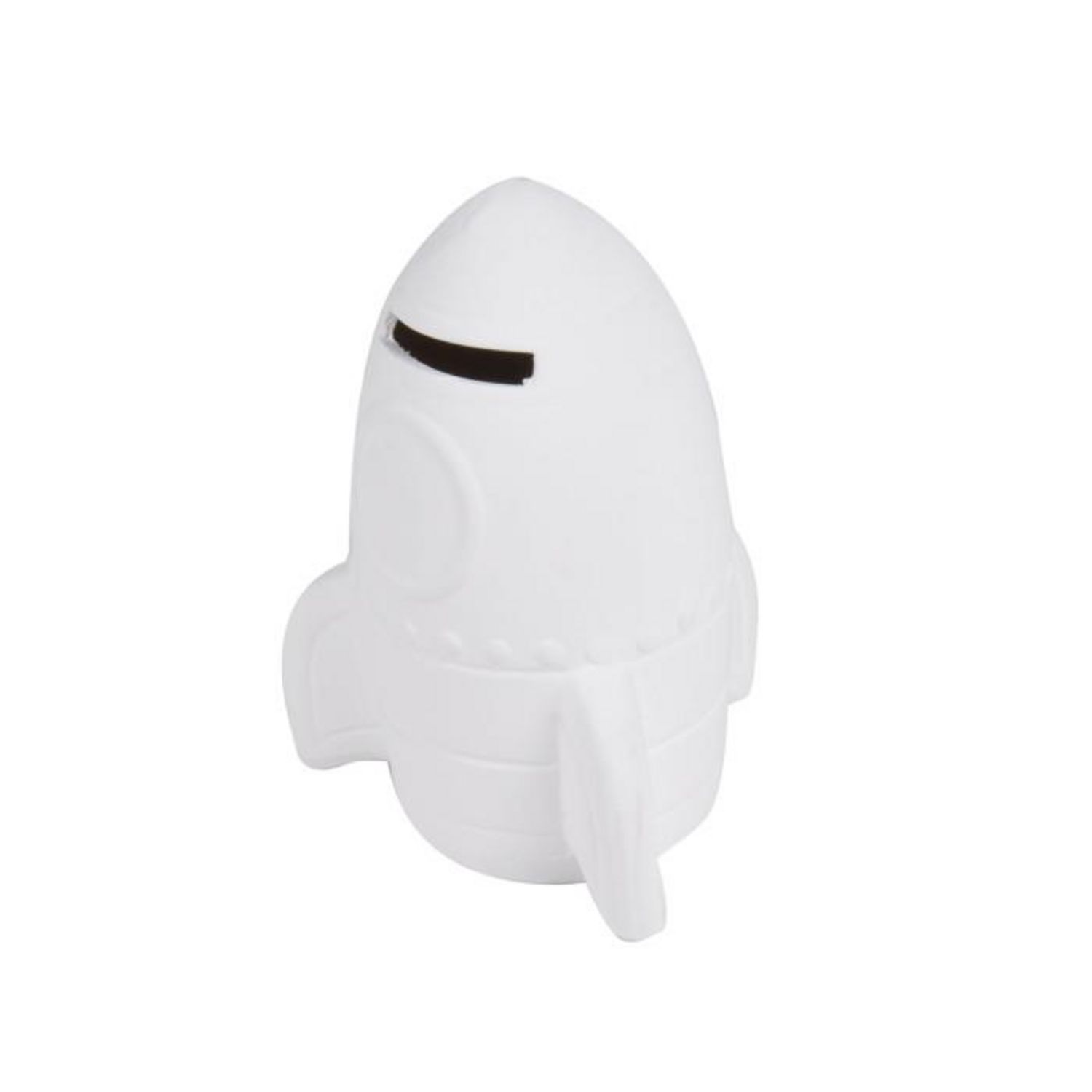 Informations Techniques : Dimensions : L. 9,5 x l. 9 x H. 13 cm Matière : Céramique Spécificités : Utile & Pratique Tirelire enfant Forme Fusée A Personnaliser Couleur : Blanc