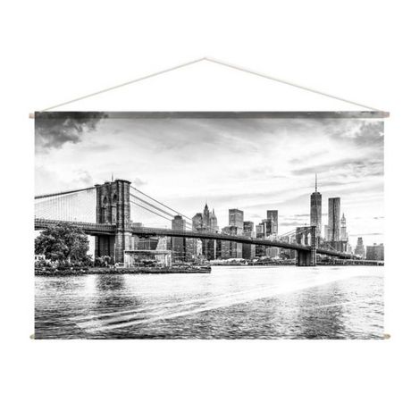 Informations Techniques : Dimensions : L. 150 x H. 90 cm Matière : 80% Coton recyclé & 20% Polyester Spécificités : Tendance & Déco Toile déco murale Imprimé ville 2 tringles en bois 1 corde d'accroche Couleur : Noir & Blanc