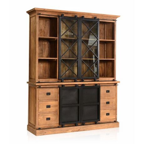 Informations Techniques : Dimensions : L. 180 x l. 50 x H. 220 cm Matières : Portes coulissantes : Métal & Verre Poignées : Métal Structure : Bois Massif Recyclé (Teck) Spécificités : Robuste & Fonctionnel Vaisselier double corps Style industriel 6 tiroirs et 4 portes coulissantes 5 doubles étagères