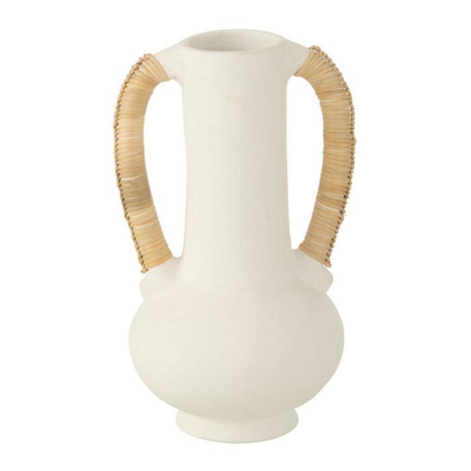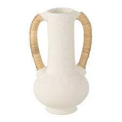 Informations Techniques : Dimensions : L. 20 x l. 20 x H. 35 cm Matières : 90% Terre cuite & 10% Rotin Spécificités : Pratique & Tendance Vase amphore déco Avec 2 poignées Vendu à l'unité Forme ronde Poids : 1,5 kg Couleur : Blanc & Naturel