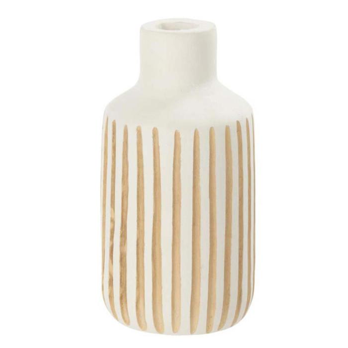 Informations Techniques : Dimensions : D. 17 x H. 33 cm Matière : Bois Spécificités : Tendance & Chic Vase design Forme ronde Vendu à l'unité Poids : 1 kg Couleur : Blanc & Naturel