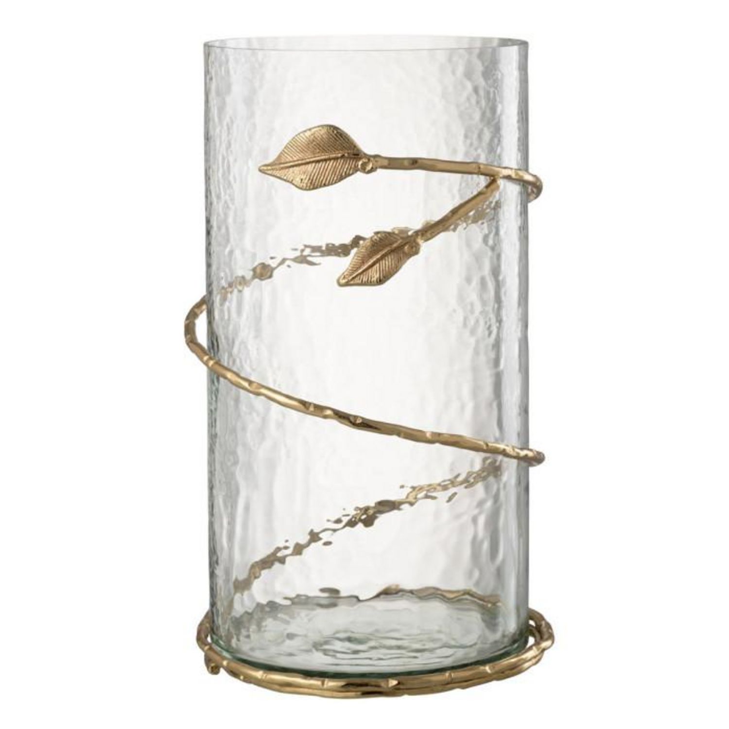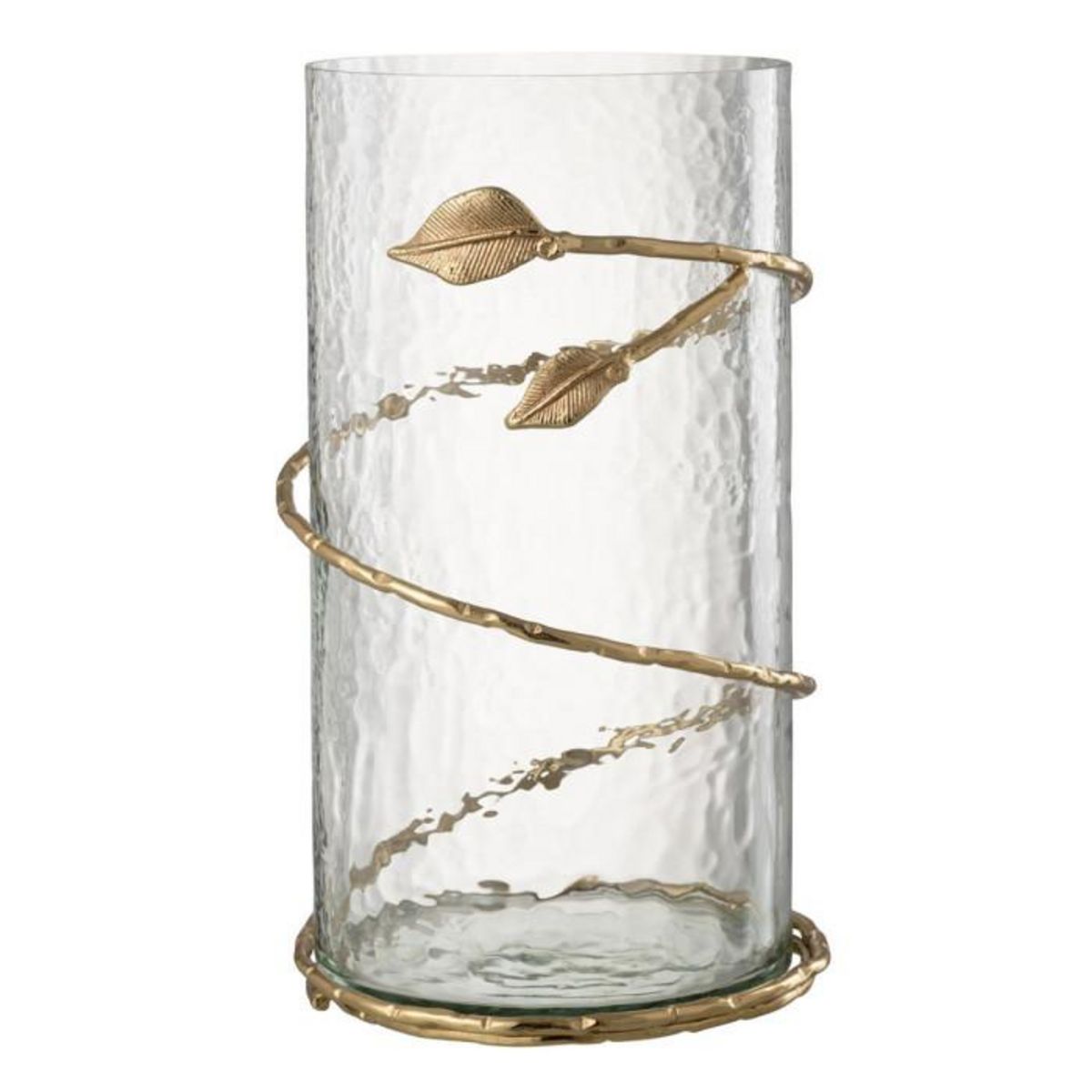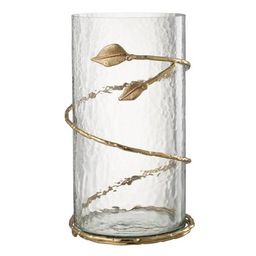 Informations Techniques : Dimensions : D. 17,5 x H. 34 cm Matières : 70% Verre & 30% Métal Spécificités : Élégant & Déco Vase cylindrique Détails feuilles Bougie non incluse Vendu à l'unité Poids : 1,9 kg Couleur : Transparent & Or