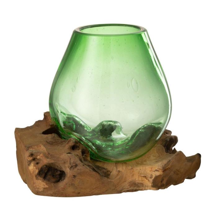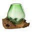 Informations Techniques : Dimensions : L. 23 x l. 19 x H. 19 cm Matières : 70% Verre & 30% Bois (Hêtre) Spécificités : Pratique & Tendance Vase déco Verre soufflé sur racine Vendu à l'unité Poids : 0,9 kg Couleur : Vert