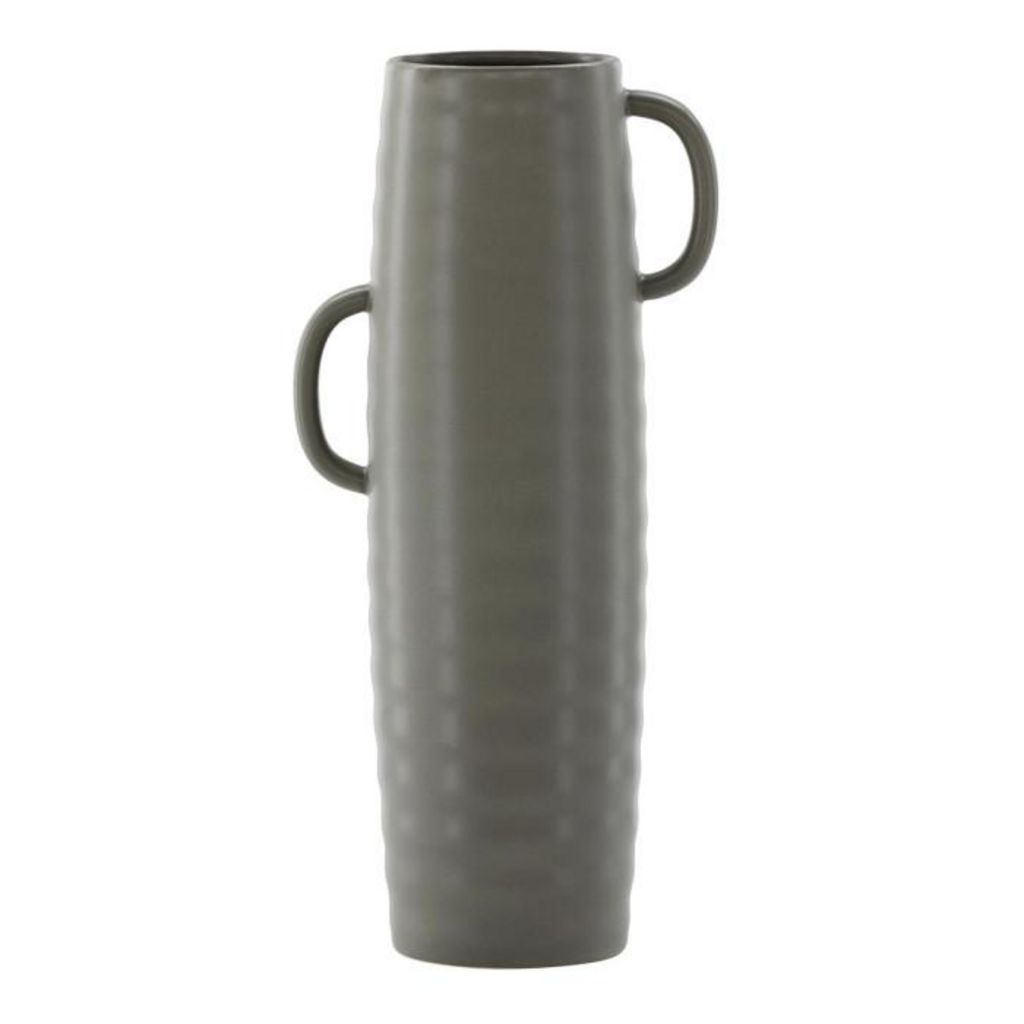 Informations Techniques : Dimensions : L. 19 x l. 13 x H. 41 cm Diamètre : D. 13 cm Matière : Grès Spécificités : Moderne & Élégant Vase design ondulé Avec petites anses Poids : 1,95 kg Couleur : Gris Foncé
