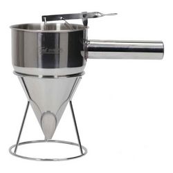 Informations Techniques : Dimensions : L. 26 x l. 13 x H. 23,5 cm Diamètre : 13 cm Matière : Métal & Acier inoxydable Spécificités : Pratique & Utile Verseur de Pâte à Piston Support inclus Idéal pour préparer facilement des Crêpes, Gaufres, Verrines ou Beignets Recettes au Dos Contenance : 1,2 L Po