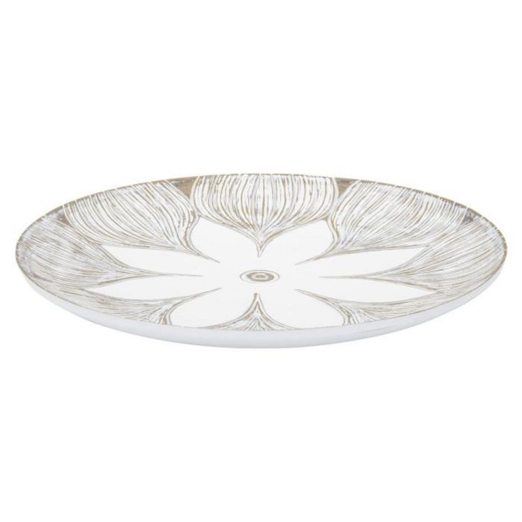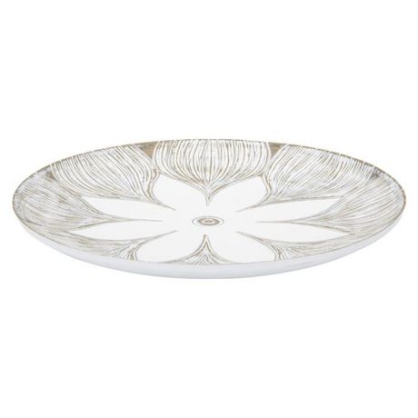 Informations Techniques : Dimensions : L. 35,5 x l. 35,5 x H. 4,4 cm Matière : Polyresine Spécificités : Pratique & Déco Vide-poche design Forme ronde Avec motif fleur Poids : 1,4 kg Couleur : Blanc