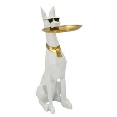 Informations Techniques : Dimensions : L. 27 x l. 51 x H. 74 cm Plateau : D. 30 cm Matières : Polyrésine & Métal Spécificités : Utile & Chic Statue chien Design origami Plateau rond Poids : 3,5 kg Couleur : Blanc & Or