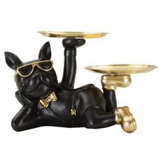 Informations Techniques : Dimensions : L. 23,5 x l. 13 x H. 18,5 cm Matières : Polyrésine & Métal Spécificités : Utile & Chic Statuette chien 2 plateau ronds Poids : 0,7 kg Couleur : Noir & Or