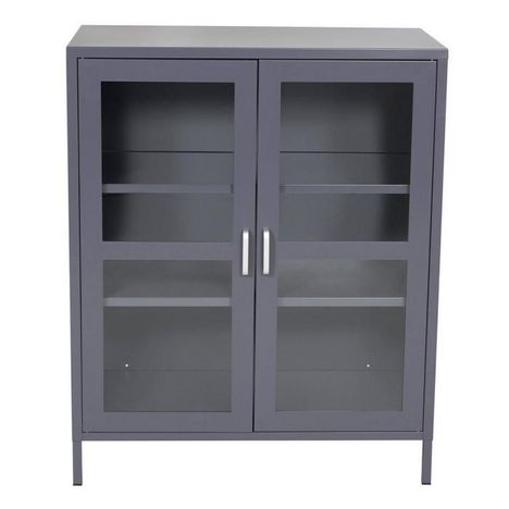 Informations Techniques : Dimensions : L. 80 x l. 43 x H. 97 cm Matières : Acier & Verre Spécificités : Élégante & Moderne Vitrine sur pied Avec 2 portes vitrées Nombre de colis : 1 Poids max supporté : 15 kg Poids : 19,5 kg Couleur : Gris Clair