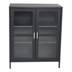 Informations Techniques : Dimensions : L. 80 x l. 43 x H. 97 cm Matières : Acier & Verre Spécificités : Élégante & Moderne Vitrine sur pied Avec 2 portes vitrées Nombre de colis : 1 Poids max supporté : 30 kg Poids : 19,5 kg Couleur : Noir